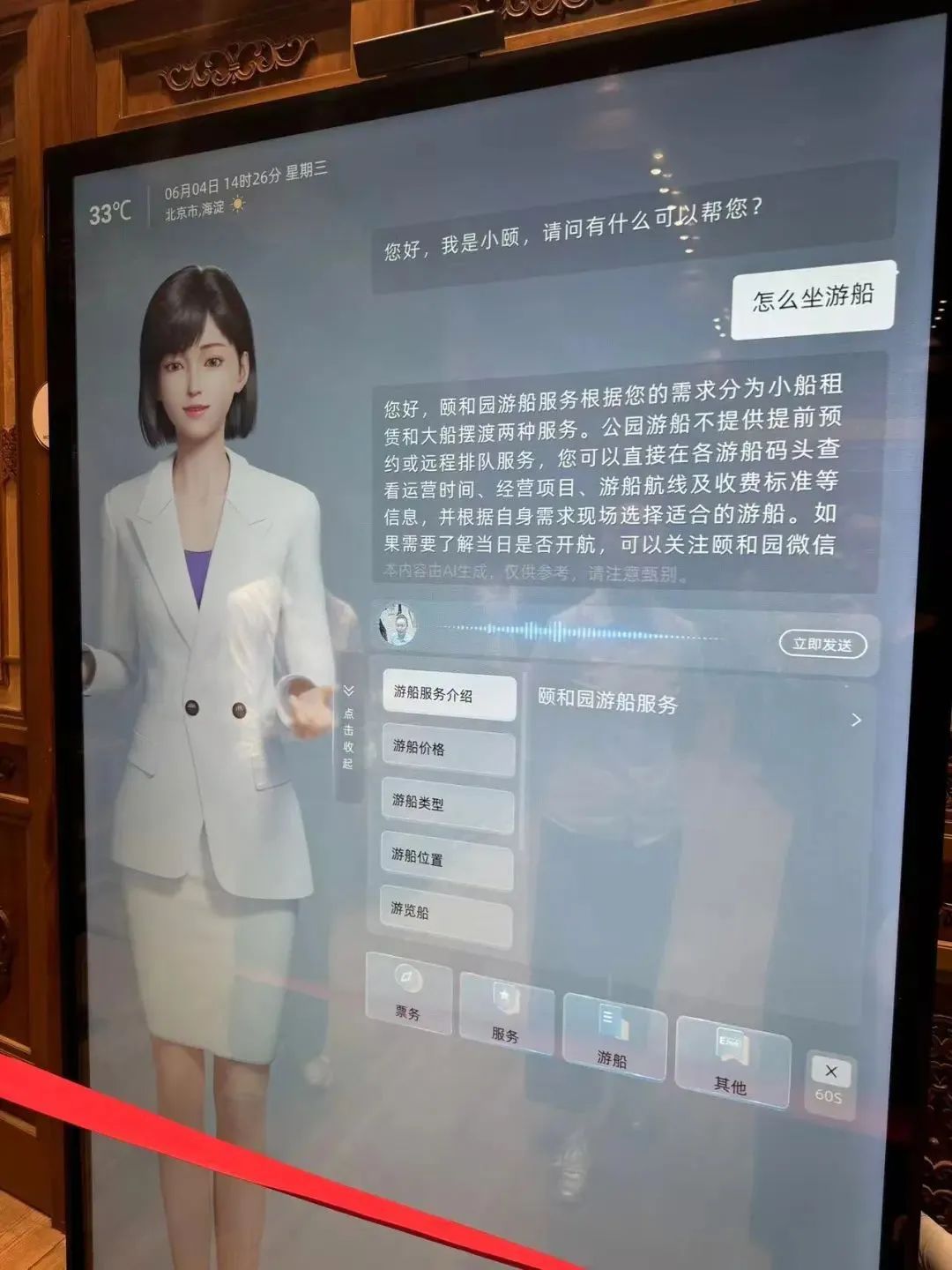 颐和园游客服务中心内的AI数字人客服/记者拍摄